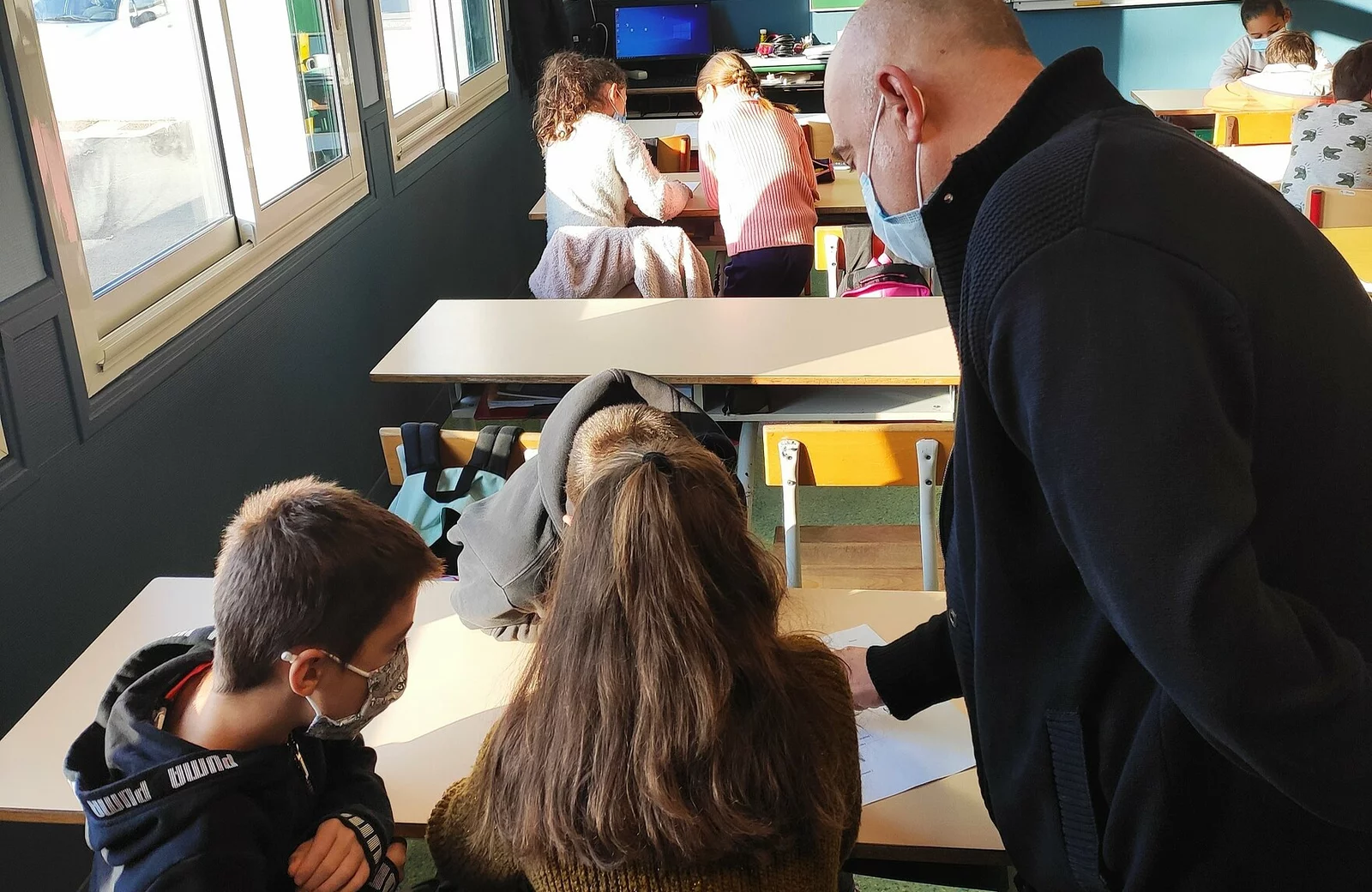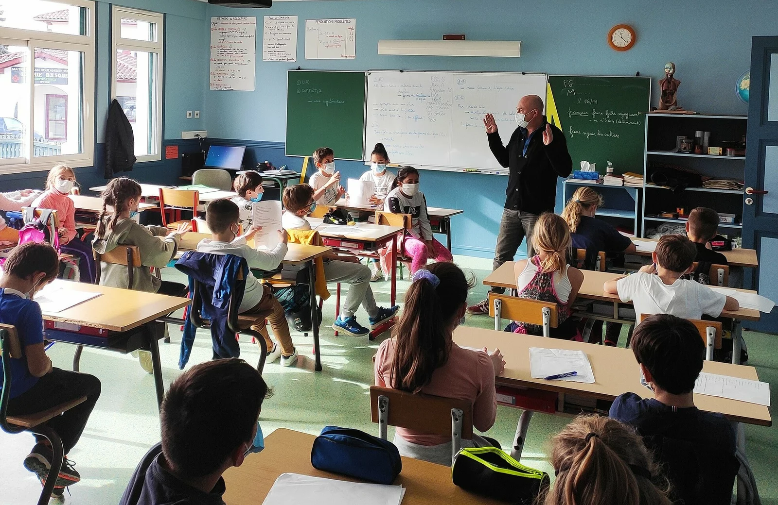 Ci-dessous, Stéphane Jaubertie en atelier d'écriture dans une classe à Jatxou