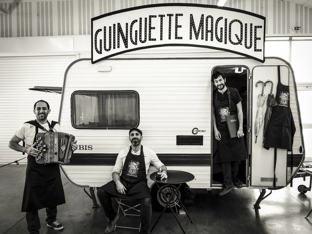 Lors de ce spectacle, les spectateurs entreront véritablement dans un univers de guinguette. Un espace de terrasse à ciel ouvert sera composé de tables et de chaises. Nous retrouverons l’esprit guinguette avec ses guirlandes caractéristiques qui délimiteront l’espace de jeu.