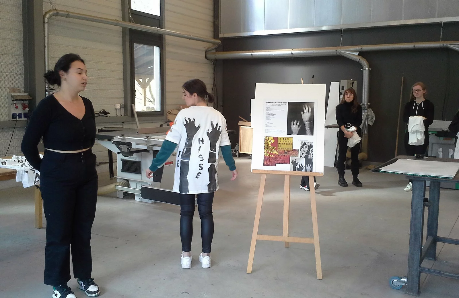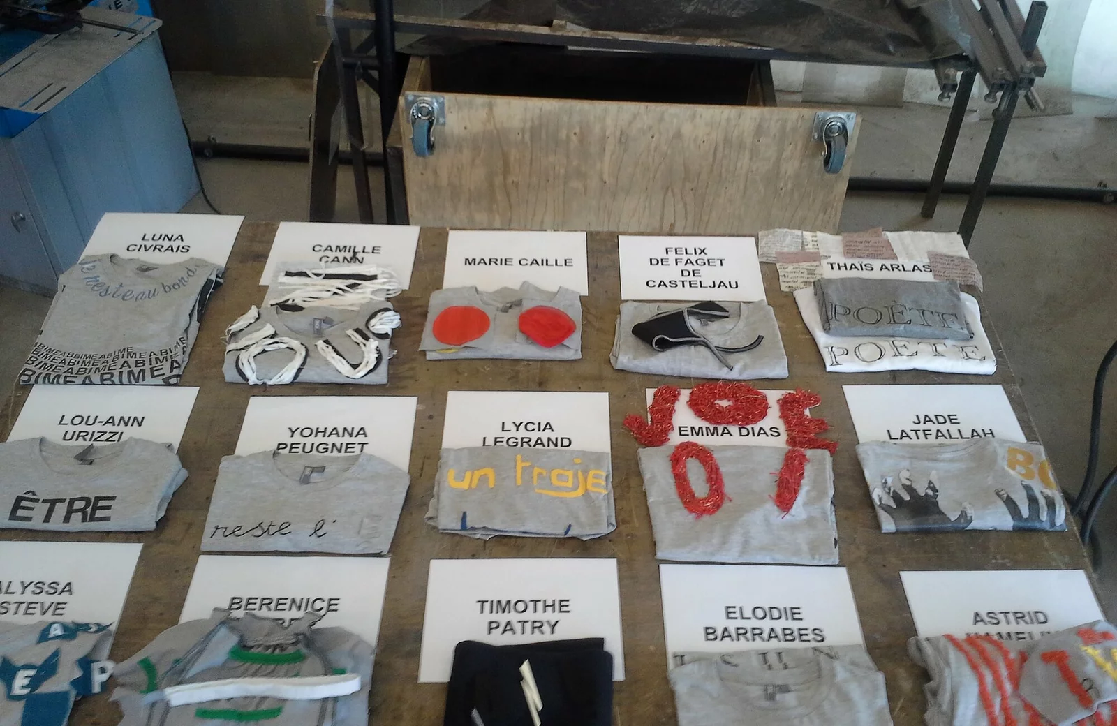 Après avoir travaillé le texte Le Message, de l’auteure Andrée Chédid, les étudiants ont imaginé une déclinaison de pièces textiles portant des messages philosophiques.