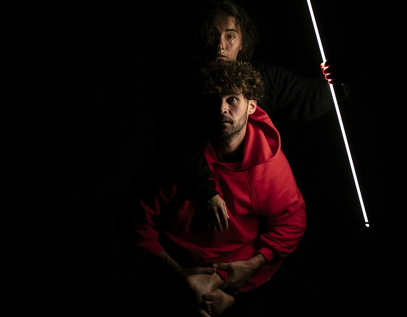 Kirol jantziekin beztitu bi dantzarik, zuzeneko musikari batek eta neon argi andana batek giro ilun eta kezkagarria sortuko dute.