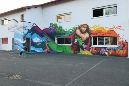 Par le biais d’ateliers avec If MATXIKOTE, les élèves ont découvert des techniques liées au Street art. Dans un premier temps, les interventions de If MATXIKOTE en classe ont permis d’étudier et d’expérimenter différents matériaux, de passer de l’idée à l’image, d’appréhender les couleurs et de préparer les dessins et les pochoirs. Dans un second temps, les séances de pratique en extérieur ont été consacrées à la création de la fresque collective. Pour nourrir sa pratique, ses connaissances et sa réflexion, chaque élève a participé à deux sorties proposées et organisées par la Communauté d’Agglomération Pays basque : une visite au festival de Street art Points de vue à Bayonne et le visionnage du spectacle « Versant vivant » du Collectif Phauna.