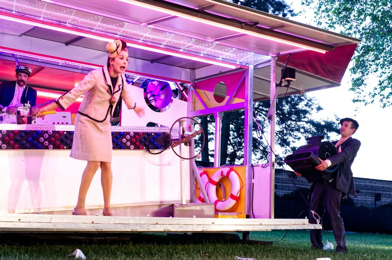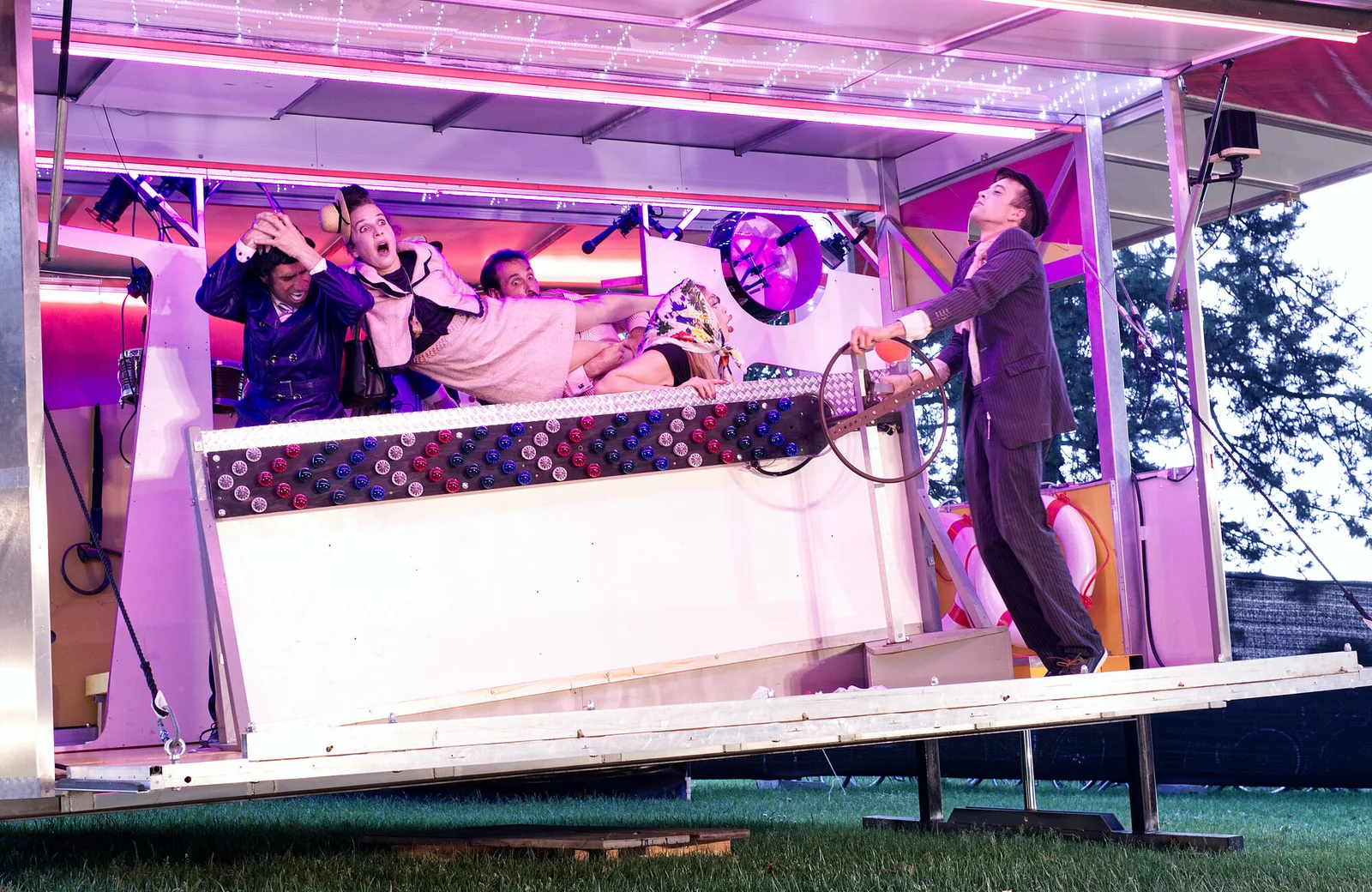 Apocalypso est une distraction de fête foraine, garantissant aux visiteurs sensations fortes et bouleversements émotionnels. La plateforme est un bateau de croisière en train de sombrer. L’ambiance y est enjouée par une musique carnavalesque de style Calypso. L’étourdissement éprouvé par les visiteurs participe ingénieusement au service de cette machine à distraction. Le plaisir, peu importe son prix, emprisonne les consommateurs, dans le «ici est maintenant», et les rend tous plus capricieux les uns que les autres. Ainsi, le groupe de protagonistes se retrouve à travailler pour le compte d’un système de divertissement, de manière bénévole, et sans même s’en rendre compte C ‘est un système ludique et attrayant, d’autant plus, qu’il génère des profits exorbitants, et encore plus lorsqu’il semble s’effondrer.