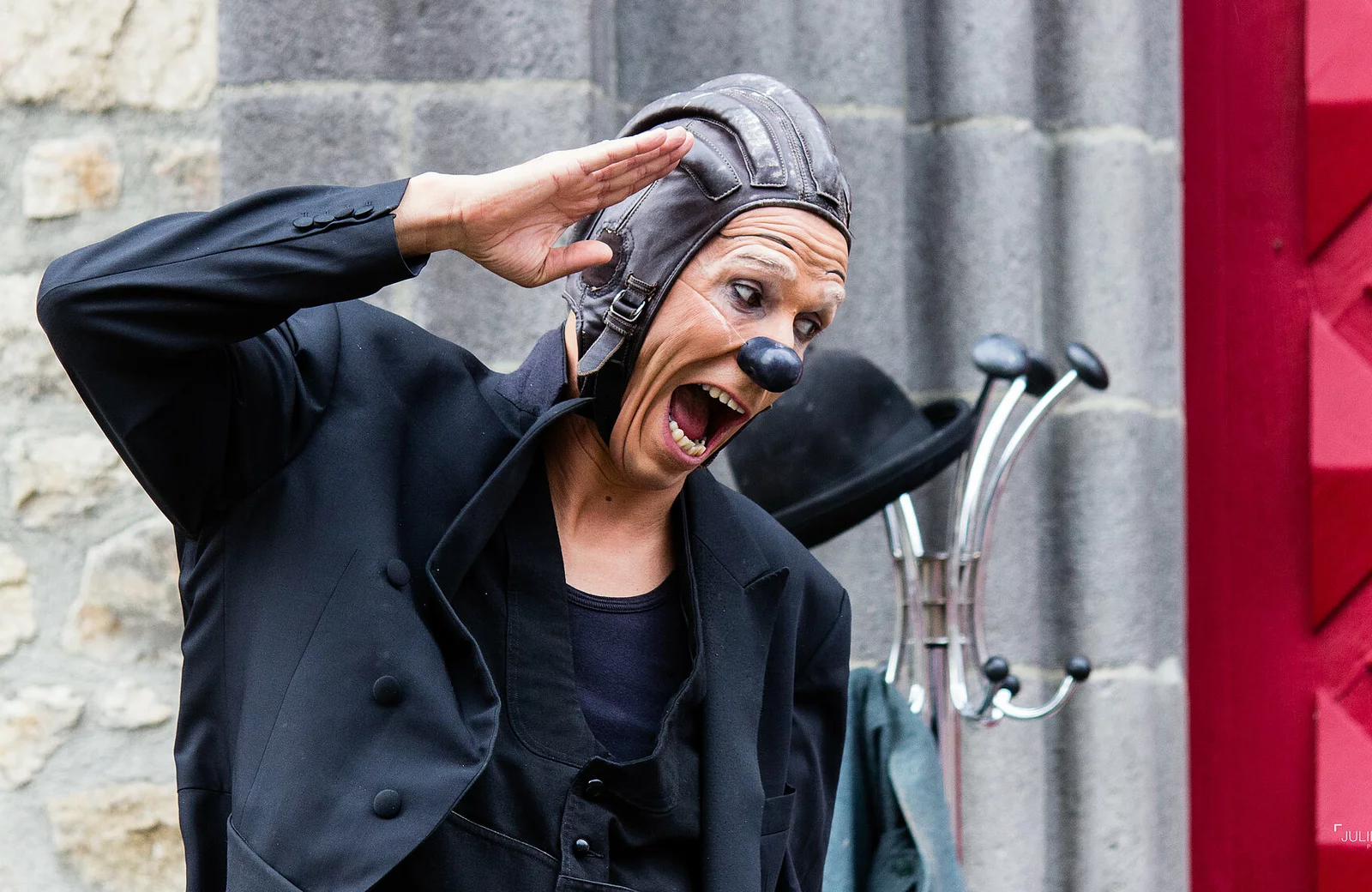 C’est dans cette confrontation cartoonesque d’aérien et de pesanteur, que notre clown amorcera le détonateur de ce qu’il est : un provocateur (…d’empathie !) et un improvisateur de rue.