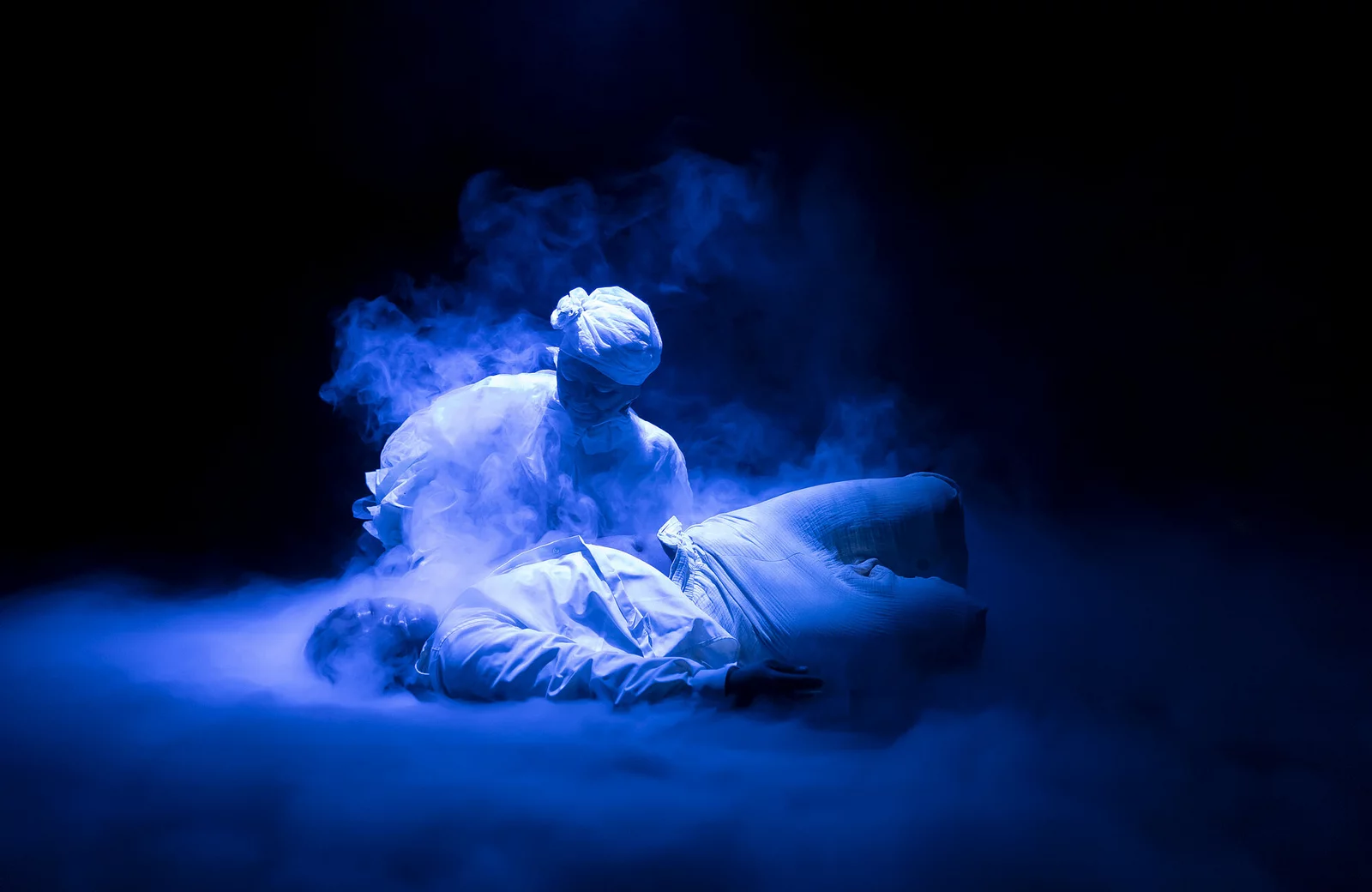 Andy Scott Ngoua danse avec leurs présences volatiles sous forme d'images projetées, de marionnettes de corps et de langue des signes.